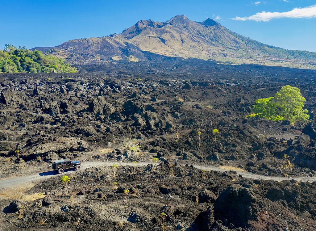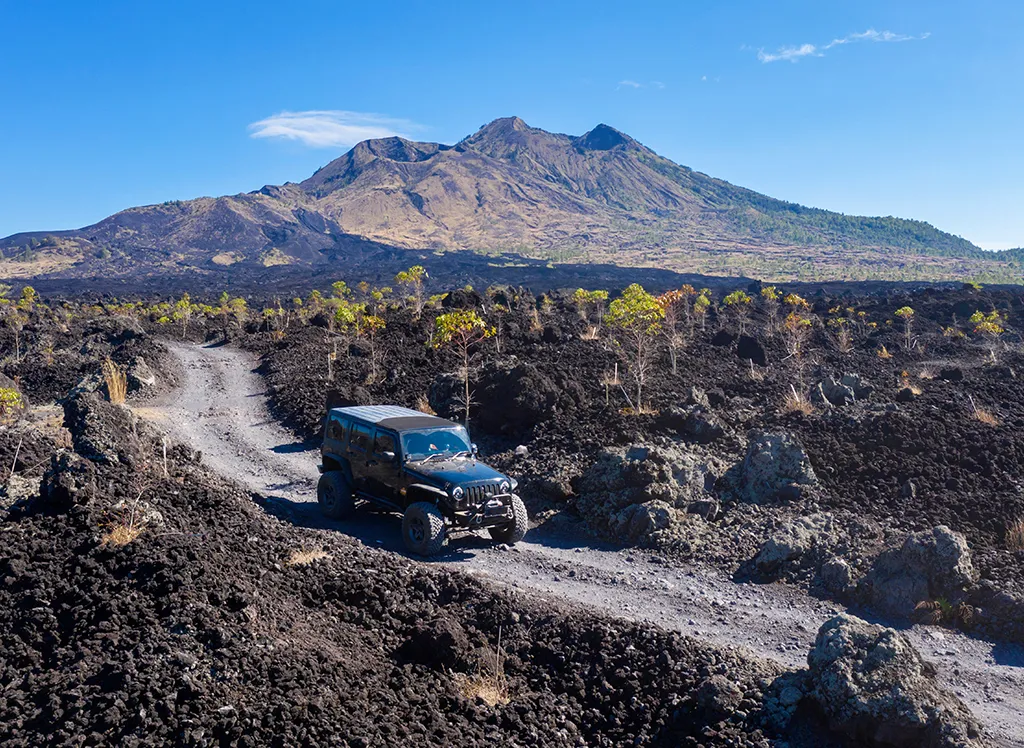 Upplev en unik jeeptur i Batur Caldera på Bali. Kör genom svarta lavaområden och sandlägenheter, koppla av i naturliga varma källor och njut av en lokal lunch.