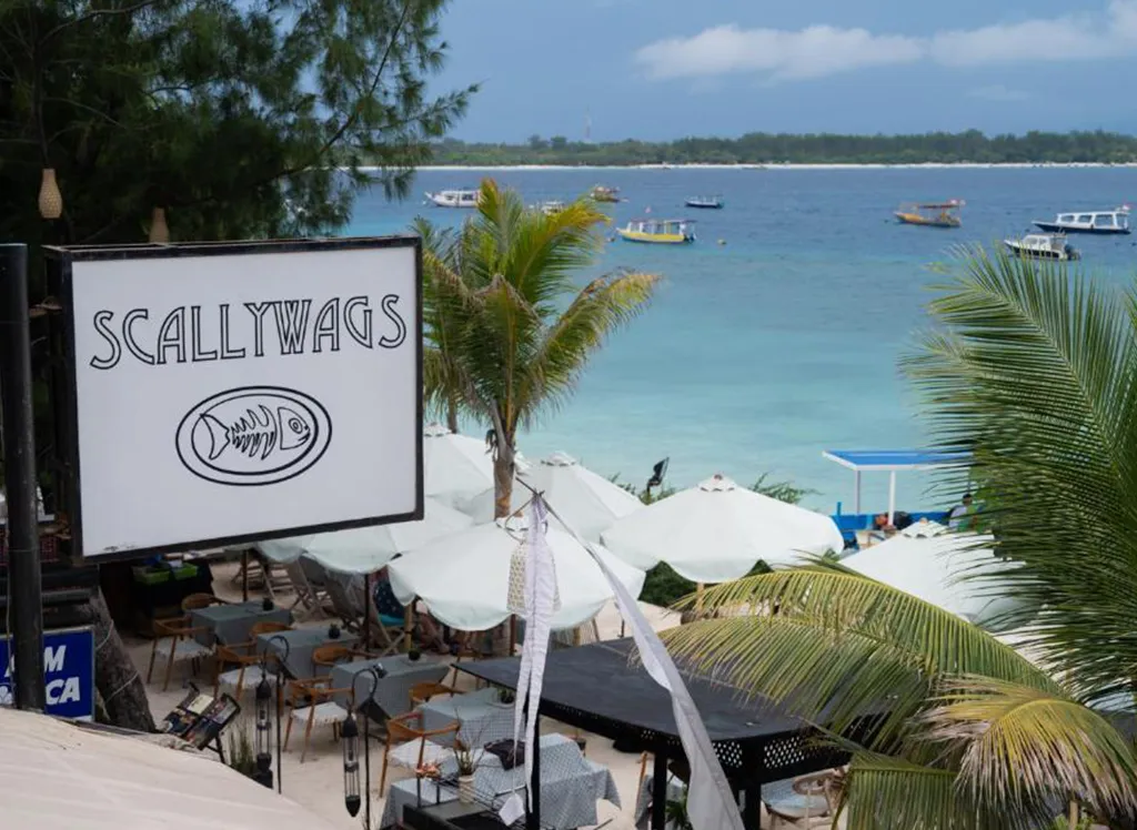 Scallywags Trawangan Resort ligger vid Gili Trawangans sydostkust med fantastisk utsikt över Mount Rinjani och Lombok-kusten, bara 5 minuters promenad från hamnen.