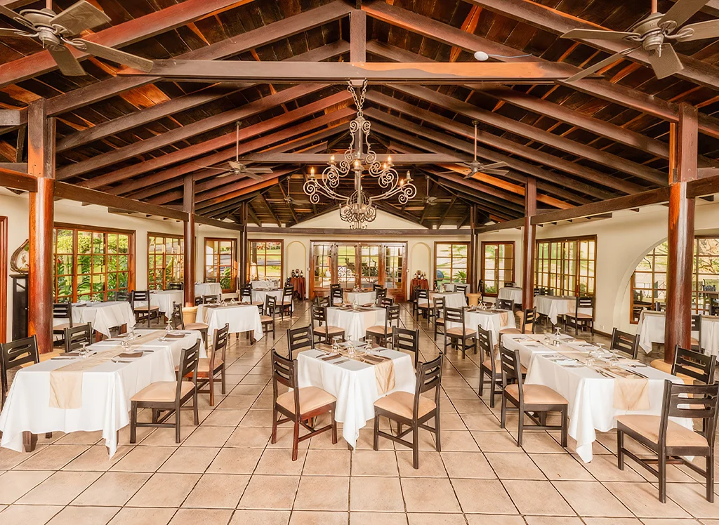 Restaurangen erbjuder en blandning av internationella rätter och costaricanska specialiteter, serverade i natursköna omgivningar med utsikt över det omgivande landskapet. Dessutom kan du koppla av i resortets bar, där det serveras snacks och förfriskningar i en informell och mysig atmosfär.