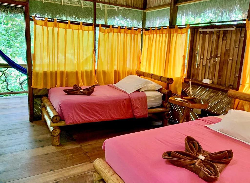 Du bor i rustika och bekväma cabañas, som alla är byggda i naturliga material och harmoniserar med omgivningarna. Rummen har myggnät runt sängarna, balkong eller terrass med utsikt över naturen. Dessutom erbjuds Wi-Fi i gemensamma områden. Här får du enkel komfort och en nära förbindelse till den omgivande regnskogen.
