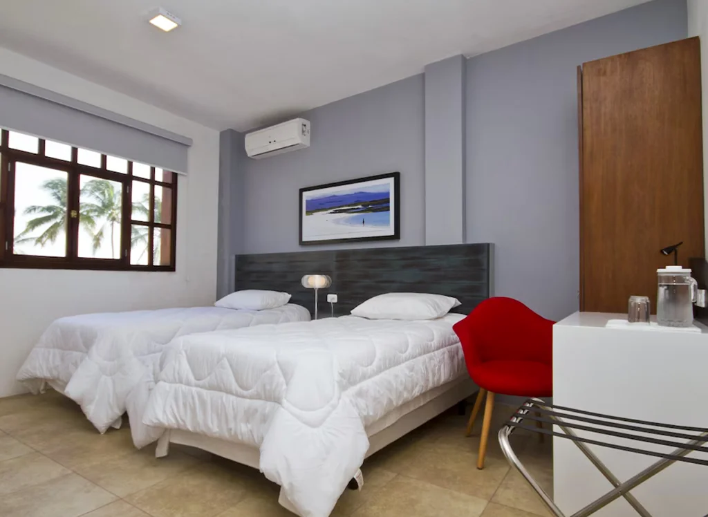 Rummen är utrustade med luftkonditionering, Wi‑Fi och värdeskåp och har antingen dubbelsäng eller två enkelsängar—perfekt för en bekväm och avkopplande vistelse.