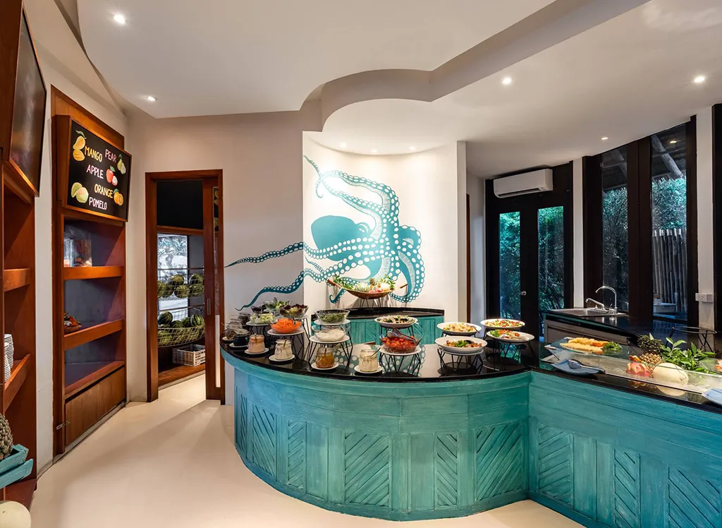 SAii Phi Phi Island Village erbjuder, förutom den överdådiga frukostbuffén, flera olika restauranger, som serverar allt från smörgåsar och snacks på stranden till äkta thailändska rätter och nygrillade skaldjur med utsikt över de frodiga växterna och vackra Andamansjön.