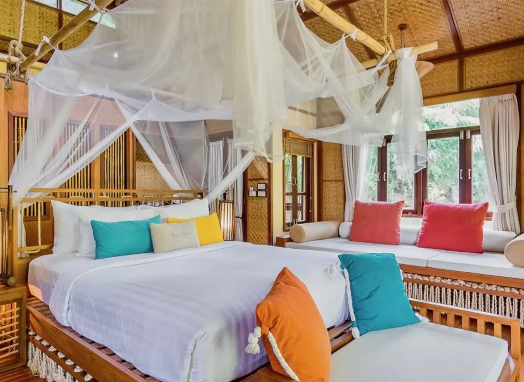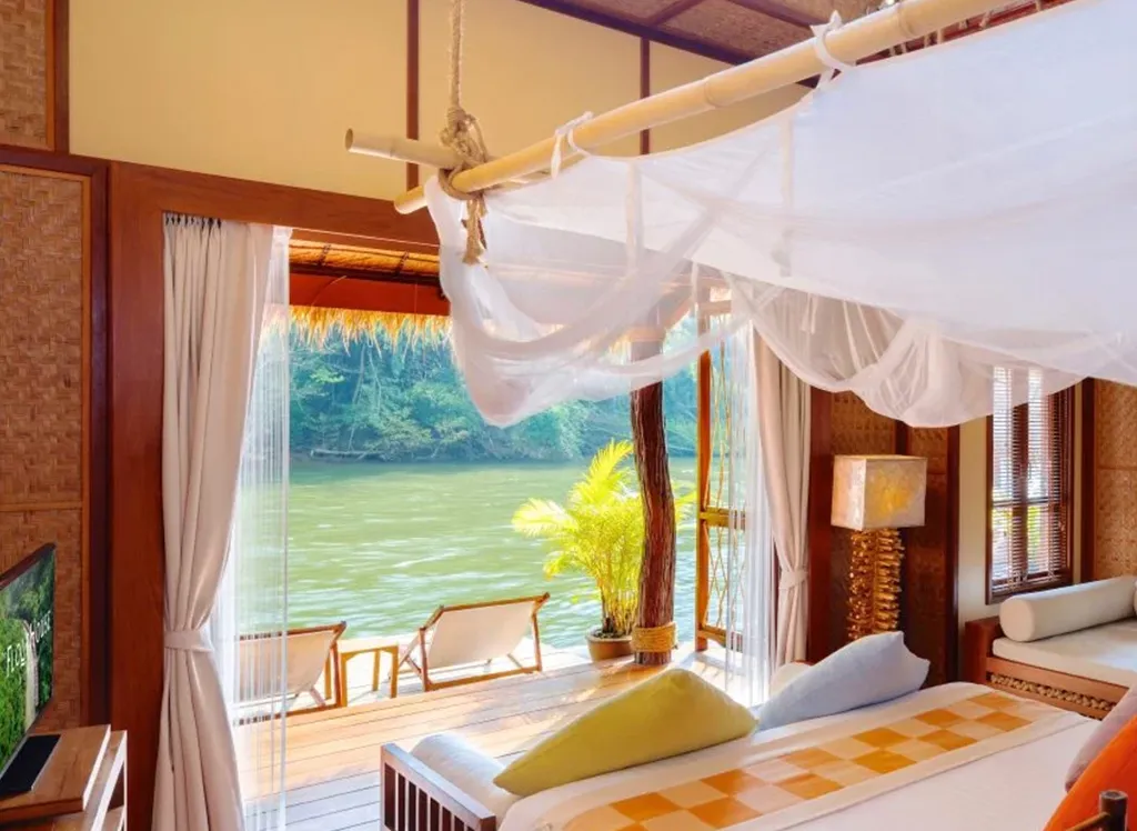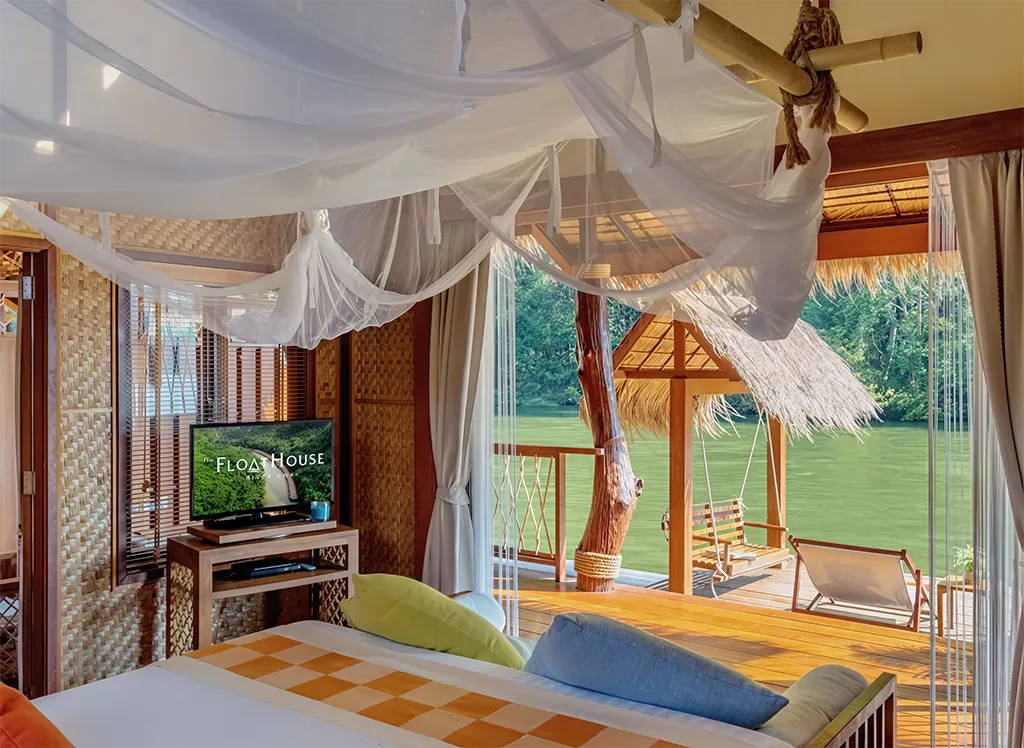 På The FloatHouse River Kwai bor du i en lyxig och rymlig flytande villa med halmtak och teakmöbler, luftkonditionering, kylskåp och TV. Varje bungalow har också en privat veranda med fantastisk utsikt över floden Kwai. Observera att tillgången till el är begränsad och att elen vanligtvis är tillgänglig från kväll till morgon.