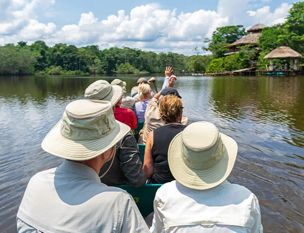 Amazonas-äventyret börjar med en 20 minuters båttur i motoriserad kanot genom regnskogen till lodgen. Floden slingrar sig som en orm genom djungeln och är livsnerven i detta frodiga område.