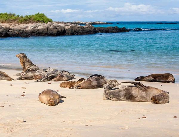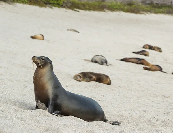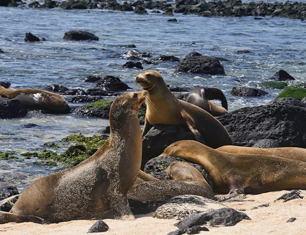 På eftermiddagen går turen till La Lobería – en strand känd för sina stora sjölejon. De är nyfikna och simmar ofta nära när du snorklar i det klara vattnet. Du kan också se dem ligga på klipporna eller slappa i sanden. Längs stranden finns det dessutom goda chanser att se gulsporrar, fregattfåglar och flera arter av Darwins finkar. Mellan klipporna lever också havsleguaner – en art du bara hittar på Galapagos.