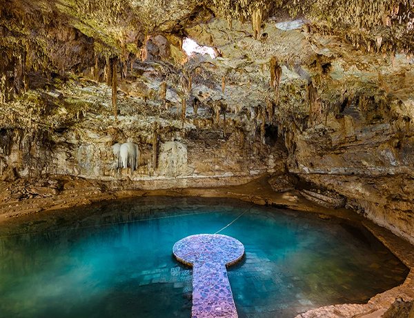 Ett besök i en cenote är en uppfriskande paus från värmen och en unik naturupplevelse.